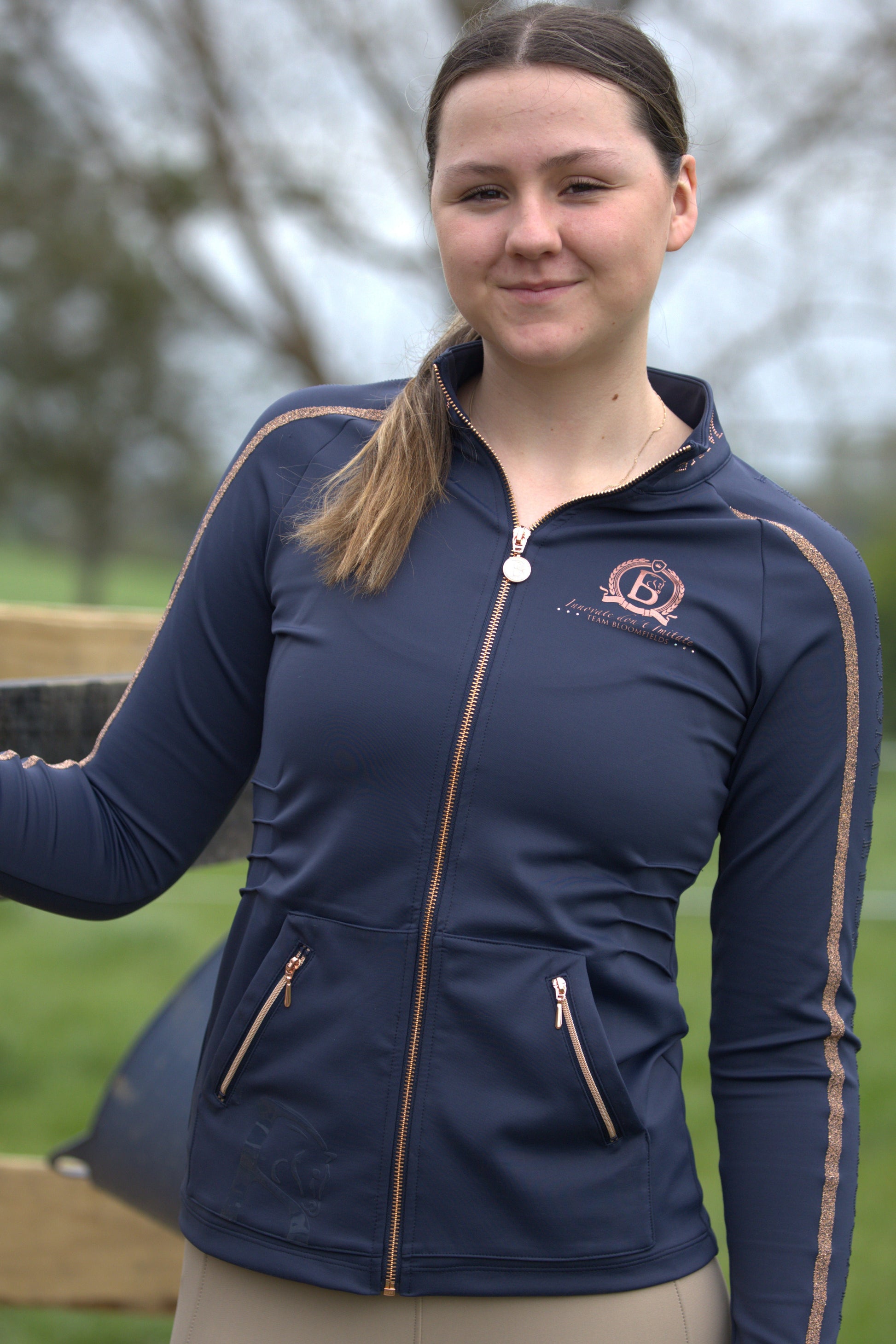Finished in navy with rose gold with full zip and exquisite high neck design with Team Bloomfields in Rose Gold Rhinestone around the neck