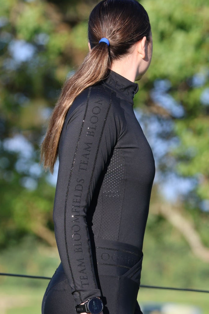 Crafted in classic black and finished with black zip and accents, this piece is designed to bring luxury to every ride. The sleeves feature Team Bloomfields in black crystals with black detailing, complemented by our signature Bloomfields “B” logo on the chest and subtle branding at the back of the neck.