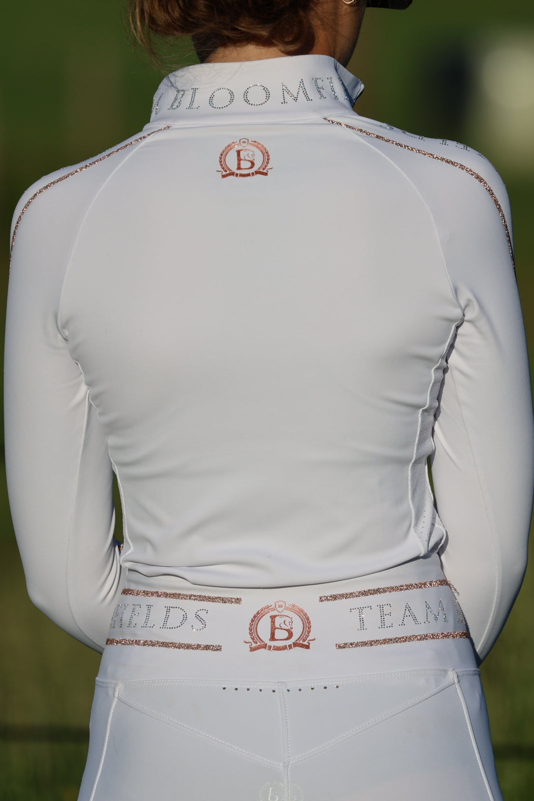 Team Bloomfields on sleeves in Blue Crystals with Rose Gold Detailing.