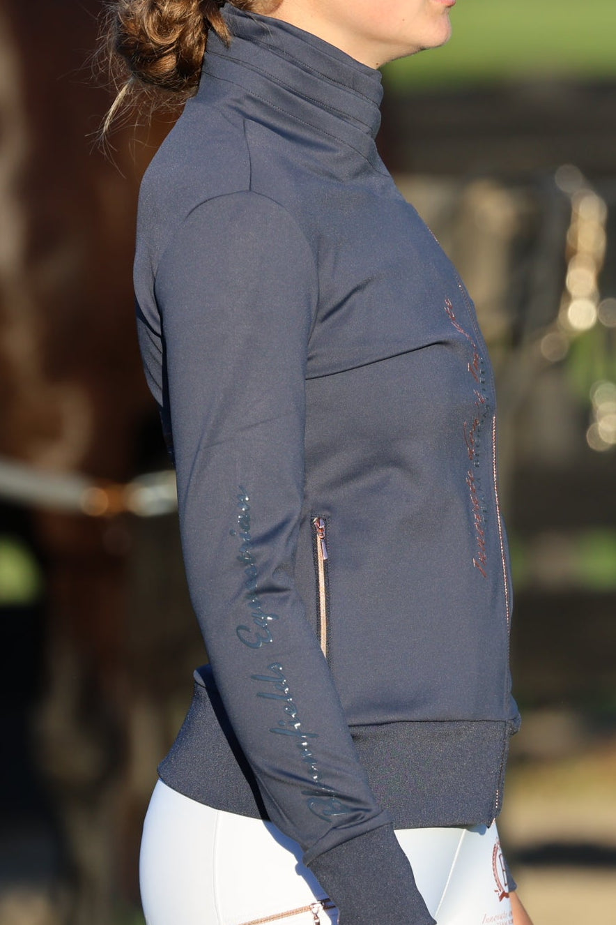 Finished in navy with rose gold with full zip and exquisite high neck unique design.